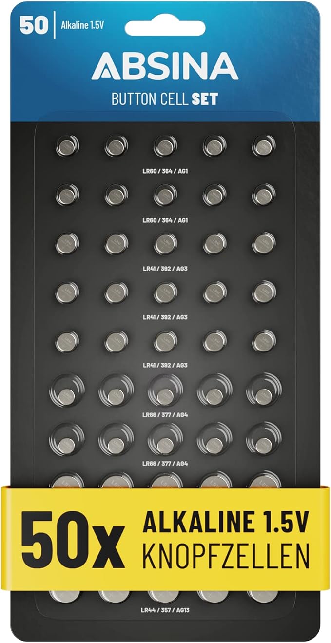 ABSINA 50er Pack Alkaline Knopfzellen Sortiment - 10x AG1 / 15x AG3 / 10x AG4 / 10x AG10 / 5X AG13-1,5V Batterie Sortiment auslaufsicher - Knopfzellen Set gemischt, Batterien Set gemischt