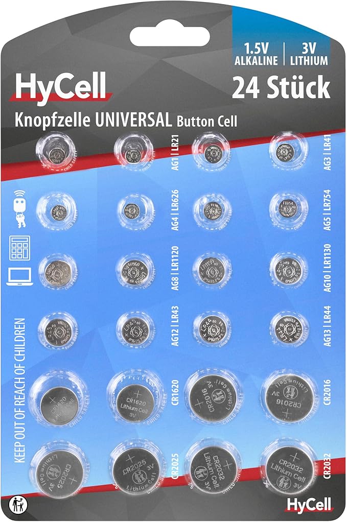 HyCell 24x Knopfzellen-Sparset/Je 2X CR2032 CR2025 CR2016 CR1620 LR41 LR43 LR44 LR626 LR621 LR754 LR1120 LR1130 / Ideal für Autoschlüssel TAN-Gerät Kinderspielzeug Uhren etc.